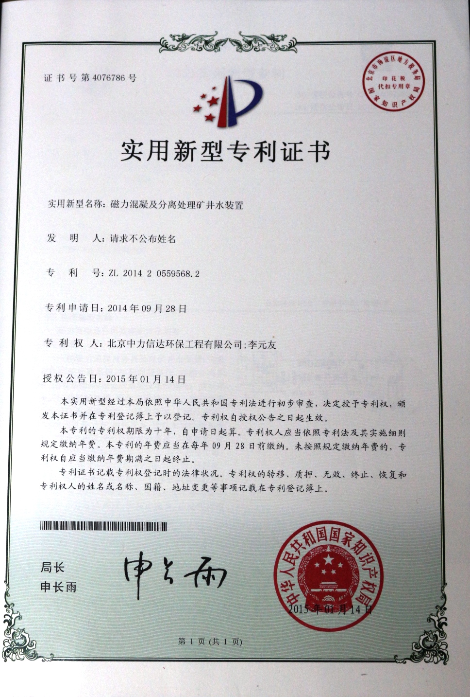 图6 专利证书(磁力混凝及分离处理矿井水装置)