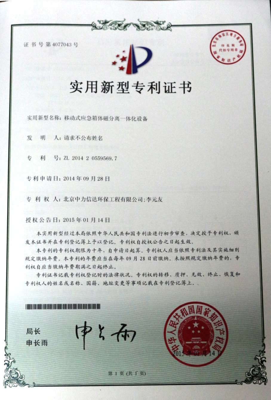 图7 专利证书(移动式应急箱体磁分离一体化设备)